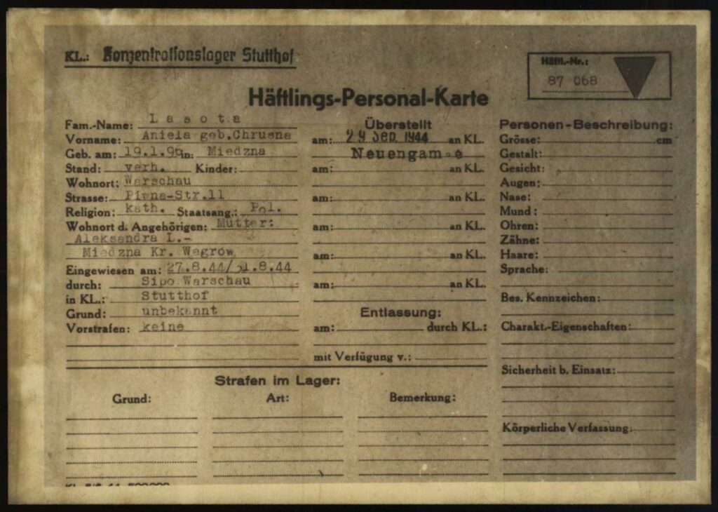 | Lasota Aniela (z d. Chrusna) | 1896 | Józef i Aleksandra | 09.1944-04.1945 | obóz Pruszków (po Powstaniu Warszawskim)/ obóz Stutthof/ obóz Neuengamme/ obóz Limmer/ obóz Bargen Belzen |